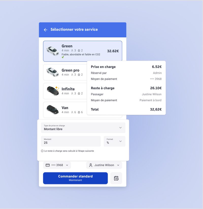 Vous pouvez définir un pourcentage pris en charge par l’entreprise, tandis que le reste reste à la charge du passager.